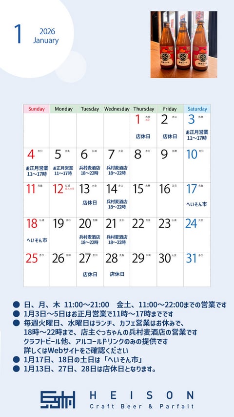 お正月営業をすでに終えてしまいましたので、その後は今月も変わらず毎週火曜日、水曜日のランチ、カフェ営業はお休みですが、夜は兵村麦酒店として、ビアバー営業します。ただ、店主ぐっちーの都合で大変申し訳ございませんが、13日、27日、28日はお休みさせていただきますのでご了承ください。