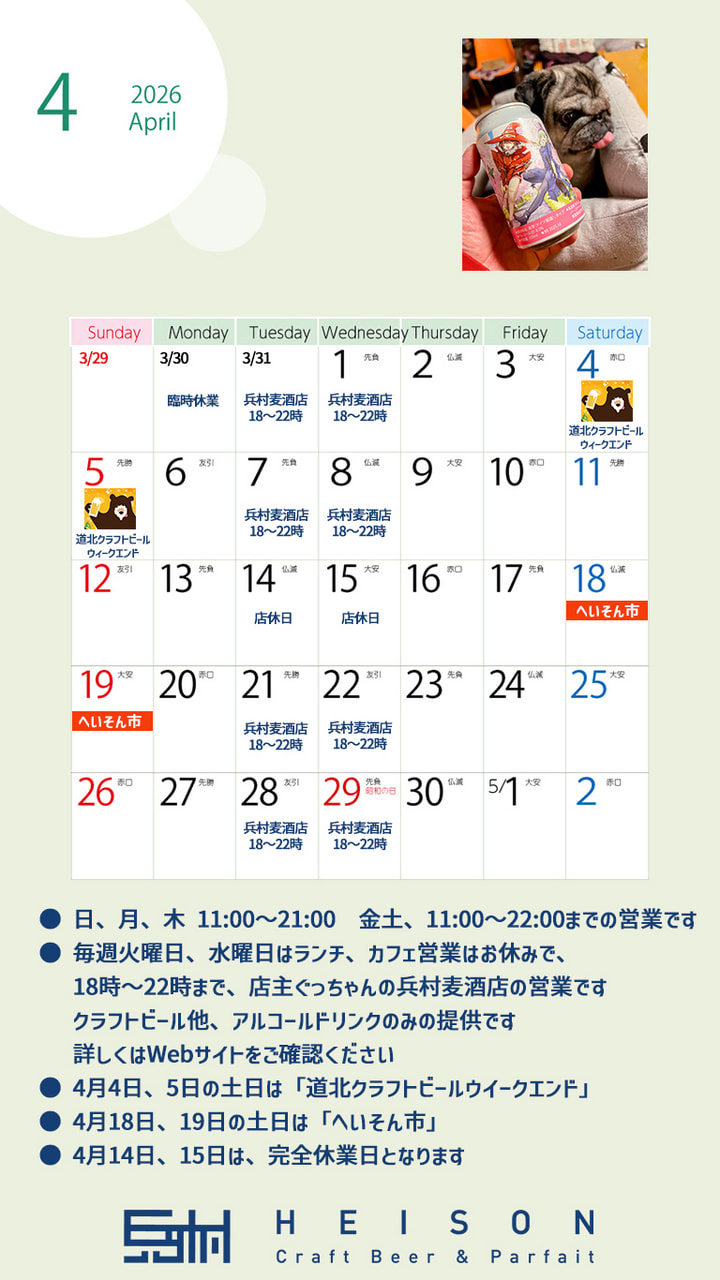 今月も東旭川民の幸せサードプレイス、HEISON Craftbeer & Parfait をどうぞよろしくお願い申し上げます。