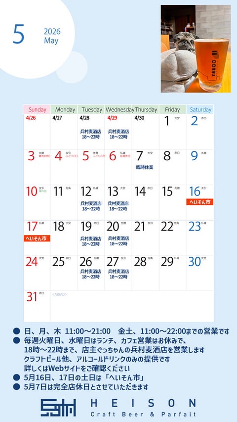 今月も東旭川民の幸せサードプレイス、HEISON Craftbeer & Parfait をどうぞよろしくお願い申し上げます。